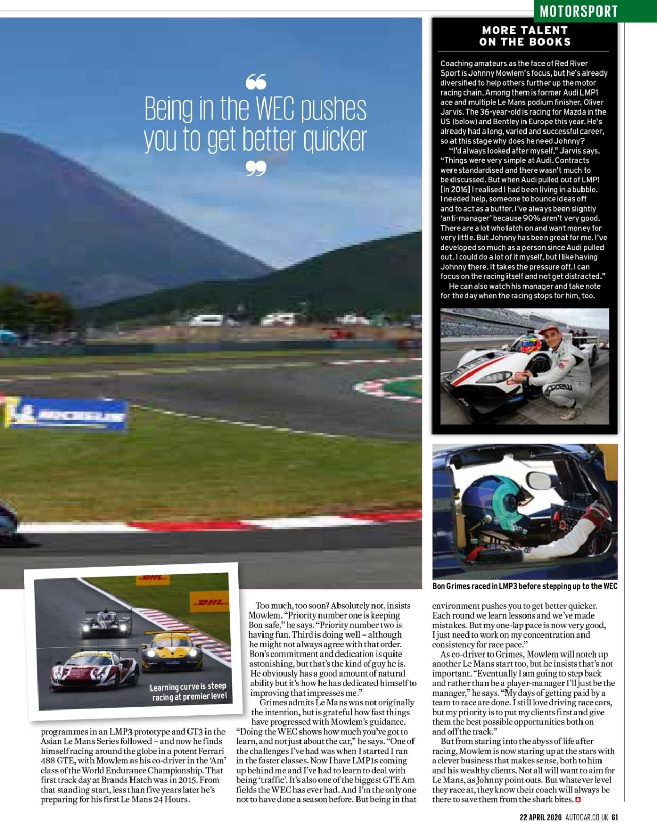 Grimes admits Le Mans was not originally the intention, but is grateful how fast things have progressed with Mowlem’s guidance. “Doing the WEC shows how much you’ve got to learn, and not just about the car,” he says. “One of the challenges I’ve had was when I started I ran in the faster classes. Now I have LMP1s coming up behind me and I’ve had to learn to deal with being ‘traffic’. It’s also one of the biggest GTE Am fields the WEC has ever had. And I’m the only one not to have done a season before. But being in that environment pushes you to get better quicker. Each round we learn lessons and we’ve made. mistakes. But my one-lap pace is now very good. I just need to work on my concentration and consistency for race pace.”